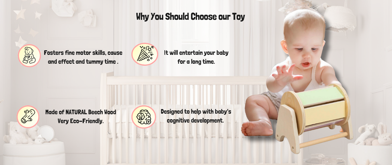 Crafted with care and backed by Montessori principles, this simple yet powerful toy offers a world of developmental benefits for your little one. The Montessori spinning drum is designed to engage your baby’s senses, nurture their cognitive abilities, and encourage independent play—all while providing endless fun.